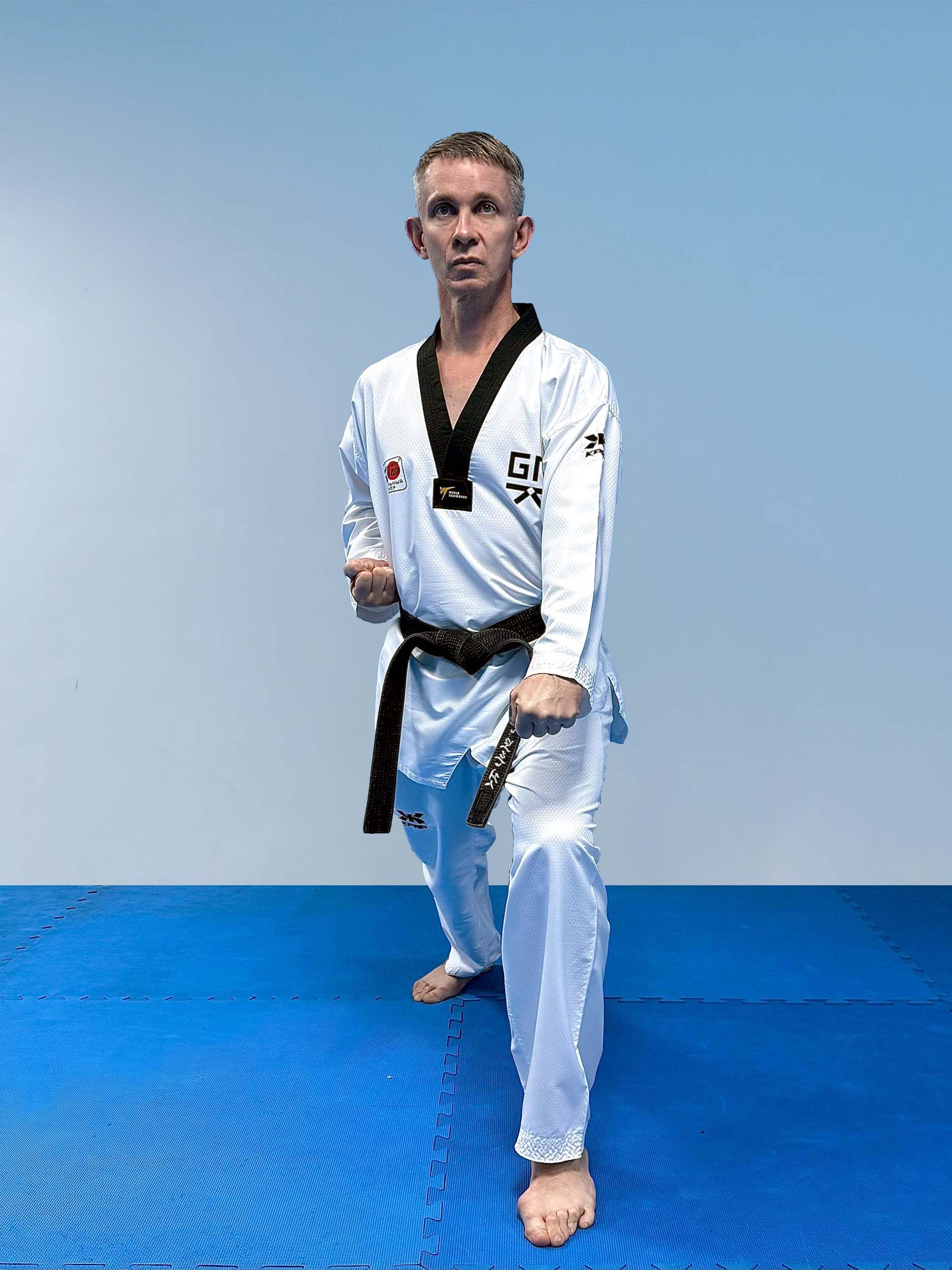 Кулак блокирующей руки проходит через точку танчжон (низ живота), рука должна остановиться над бедром, немного не дойдя до линии края корпуса.